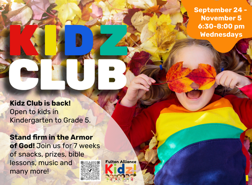 Get ready for 7 exciting weeks of faith, fun, and friendship at Kidz Club! From September 24 to November 5, kids in Kindergarten to Grade 5 are invited to join us every Wednesday from 6:30–8:00 PM (doors open at 6:15).