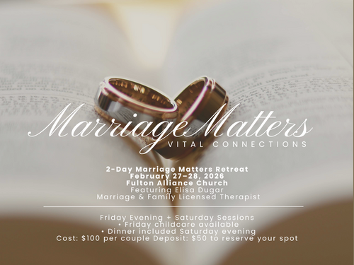 Join us for our 3rd Annual Marriage Matters Retreat, a weekend designed to strengthen marriages through meaningful connection, practical insight, and intentional time together. Couples will be encouraged and equipped by our guest speaker, Elisa Dugar, Marriage and Family Licensed Therapist.